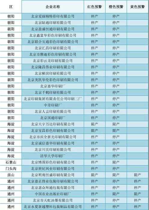 近段時(shí)間,按照新預(yù)案要求,北京市各區(qū)還重新制定了市級空氣重污染應(yīng)急企業(yè)名單,并且比去年一次性增加了500余家,使得總數(shù)達(dá)到712家之多。其中,印刷包裝企業(yè)的具體名單如下: