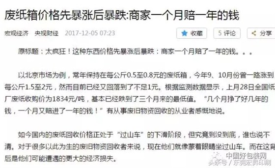 經(jīng)歷過暴跌后,紙價又已開始上漲,但未來具體走勢究竟如何,誰也說不清。近日,北京青年報經(jīng)過實地調(diào)查,并結(jié)合龍琨傳媒&中國好包裝近期的報道,發(fā)表了一片篇調(diào)查類文章,分析了廢紙價格形勢、紙價上漲原因及后續(xù)走勢,被央視財經(jīng)轉(zhuǎn)載?,F(xiàn)將主要內(nèi)容概括如下: